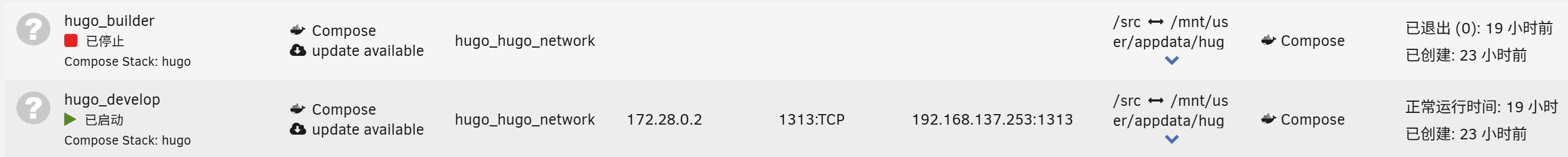 部署好之后你会在docker标签页下看到通过compose生成的镜像,这样就算几乎部署完成了,容器hugo_builder在每次运行的时候会清除旧文件并部署,每次点击运行后运行完命令hugo _builder会再次停止。