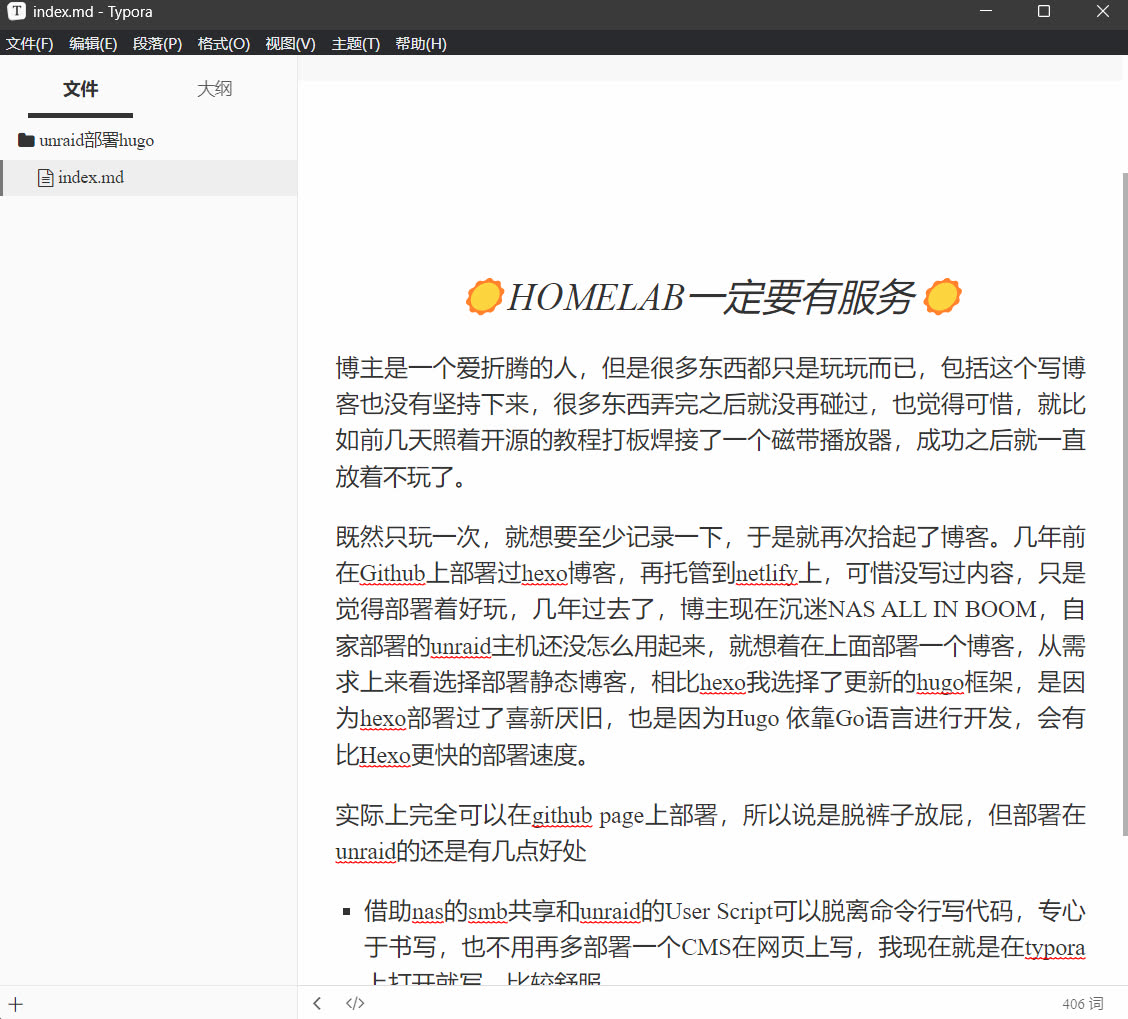 - 借助nas的smb共享和unraid的User Script可以脱离命令行写代码,专心于书写,也不用再多部署一个CMS在网页上写,我现在就是在typora上打开就写,比较舒服
